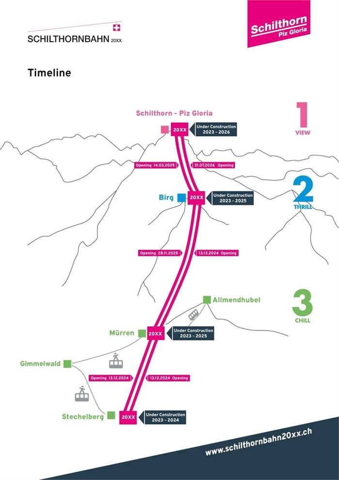 세계에서 가장 경사가 가파른 케이블카 노선을 건설중인 스위스 실토른반 유한회사의 '실토른반 20XX' 홈페이지(https://schilthornbahn20xx.ch/en/Welcome)에 실린 노선 구간별 개통 계획. [실토른반 20XX 홈페이지 캡처. DB 및 재판매 금지] 2024.12.22.