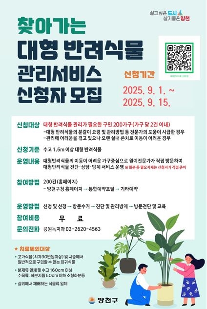 구는 중·소형 반려 식물 집사를 위한 찾아가는 관리 서비스도 진행한다. 9월 13일에는 신월2동 장수공원에서, 9월 27일에는 목3동 소공원에서 오전 10시부터 오후 5시까지 운영되며, 반려 식물을 가져와 현장에서 접수하면 된다.