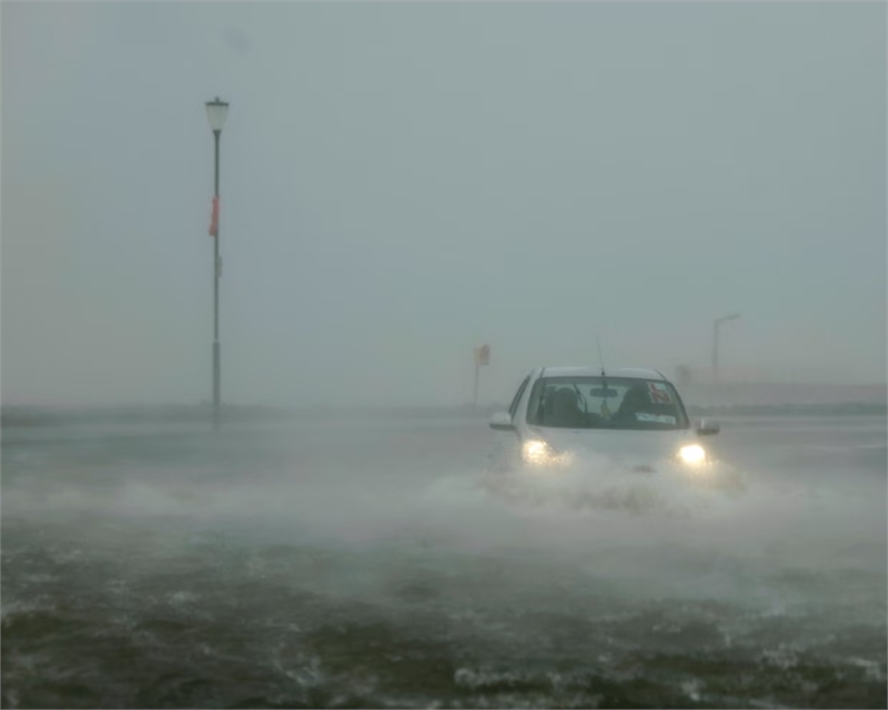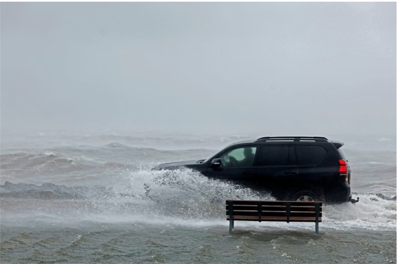 차 한 대가 이미 범람한 바닷물로 들어차 구분이 되지 않는 바다길을 따라 폐쇄된 주차장을 빠져나가기 위해 달리고 있다. (사진 : 로이터)