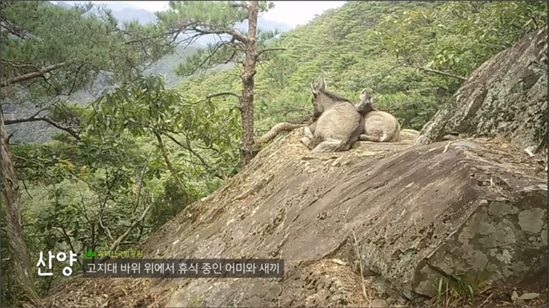 재작년 10월 9일 속리산국립공원 고지대 바위 위에서 산양과 새끼 산양이 쉬는 모습.