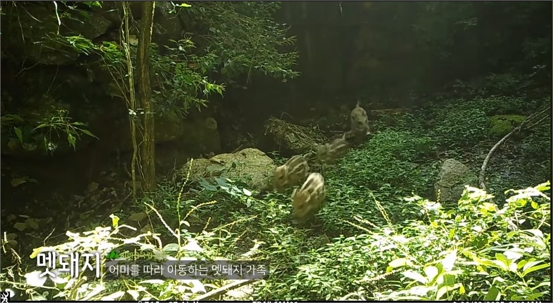 지리산 국립공원에서 어미를 따라 이동하는 멧돼지 새끼들.