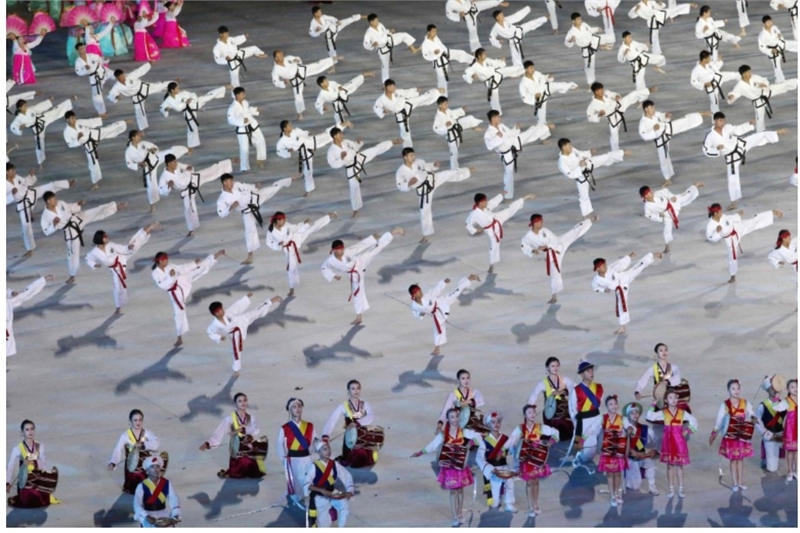 북한 조선노동당 창건 80주년 경축대회가 지난 9일 밤 평양 능라도에서 열렸다. 집단 태권도 시범.