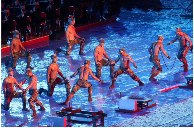 북한 조선노동당 창건 80주년 경축대회가 지난 9일 밤 평양 능라도에서 열렸다. 체조(무술) 시범 공연.