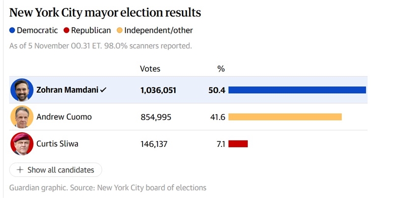 우간다 이민자 출신 무슬림 사회주의자 조란 맘다니가 미국 뉴욕주 시장으로 당선되며 녹색 파란을 일으키고 있다.