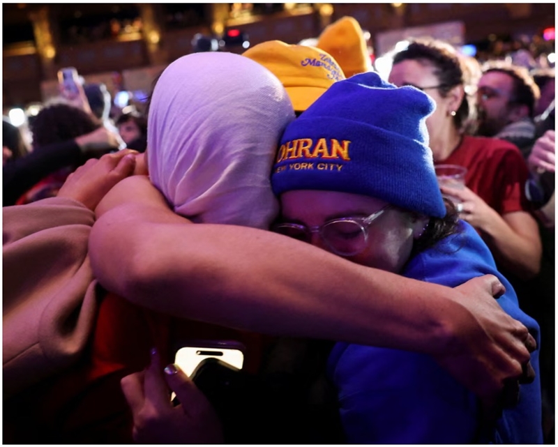 그의 지지자들이 맘다니의 승리가 확실해지고 처음 전광판에 뜨자 서로 축하하고 있다.