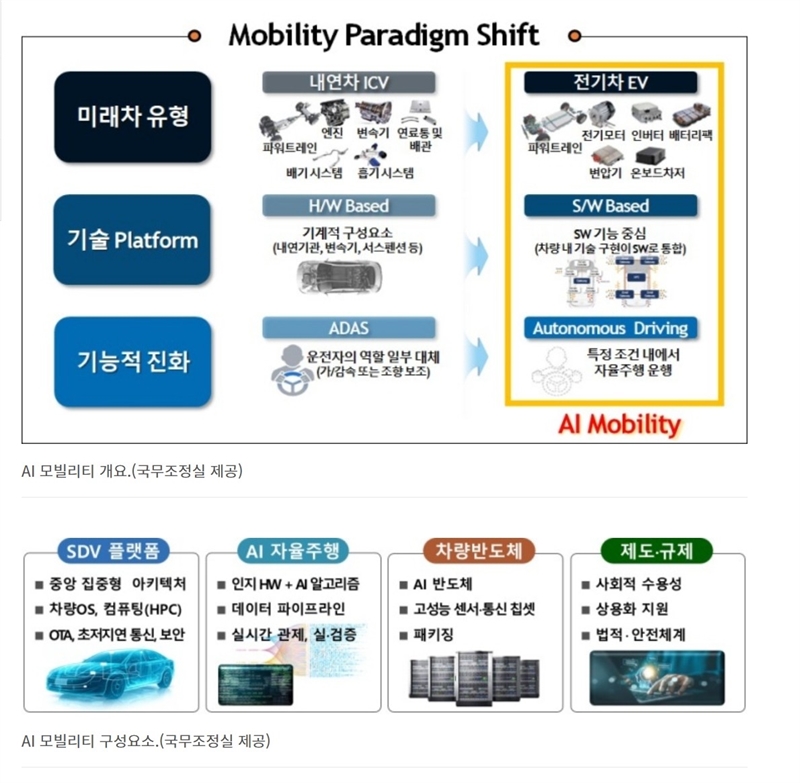 국무조정실이 배포한 모빌리티 패러다임 이동의 AI 모빌리티 개요 및, 그 구성요소 도표.