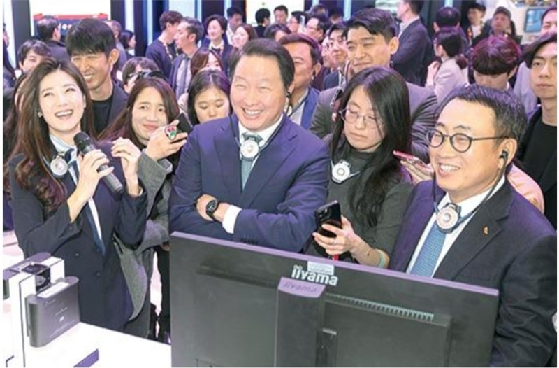 'MWC 2023년' Fira Gran Via 바르셀로나 개최 당시 박람회 전시장 내 SK텔레콤 전시관에서 AI기술에 대한 설명을 듣고 있는 최태원 SK회장의 모습.