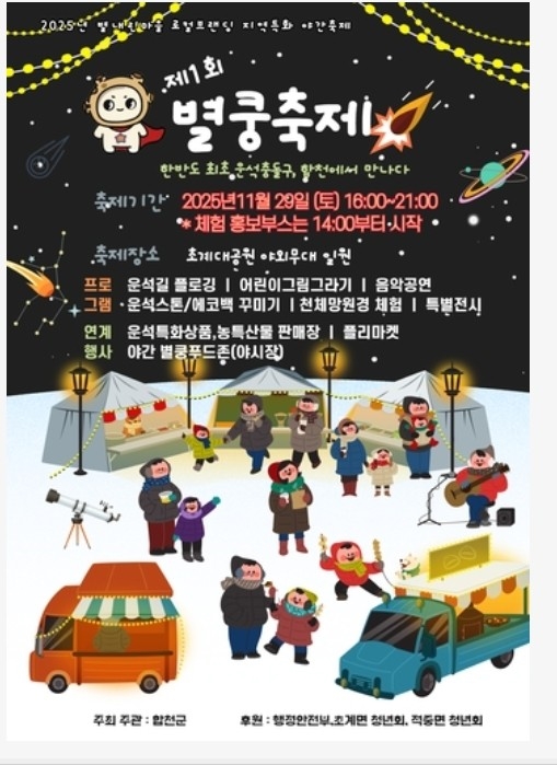 처음 개최되는 이번 축제는 2025년 생활권 단위 로컬브랜딩 활성화 사업의 일환으로, 약 5만 년 전 형성된 국내 유일무이한 운석충돌구를 보유한 합천 별내린마을의 강점을 살리고 지역주민과 관광객이 함께하는 지역특화 야간축제이다.