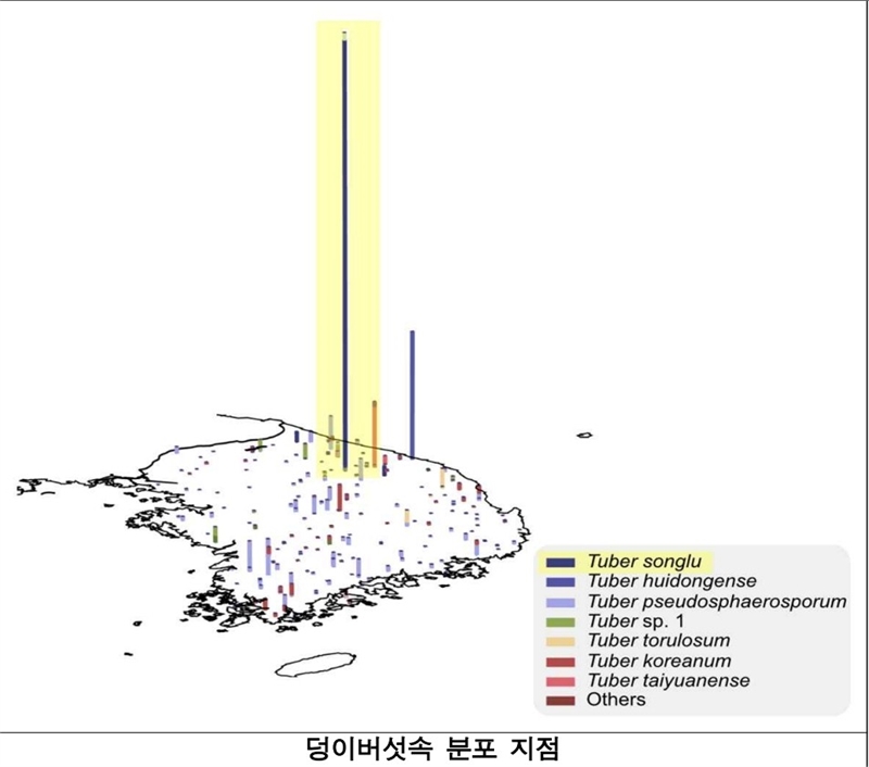 덩이버섯속(Tuber) 버섯들의 전국 분포 현황으로, 종 수준까지 동정된 종들의 위치정보를지도에 표시함 강원도 평창지역에서 국내 미기록종인 T. songlu의 분포 빈도가 가장 높게 나타남.