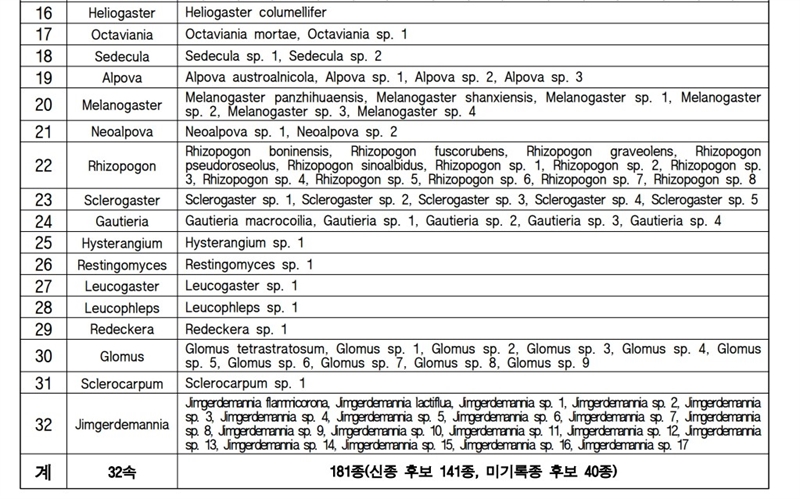 이번 연구를 통해 새롭게 확보한 버섯(자실체) 32속 181종의 유전자 정보중 141종은 세계적으로도 처음 확인된 신종 후보이며, 나머지 40종도 우리나라에서식 정보가 없던 미기록종 후보인 것으로 밝혀졌다.