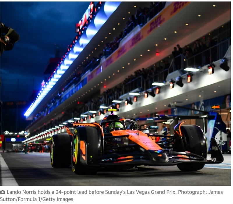 런던 노리스는 일요일 라스 베가스 그랑 프리에 앞 서 24 포인트 앞 서 선두를 차지하고 있다. 그의 자동차팀은 맥라렌이다.