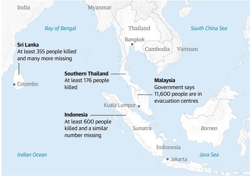 계절풍 몬순 폭우들과 열대 싸이클론들이 아시아의 일부 지역을 쓸어 버렸고, 인도네시아, 스리랑카, 태국 남부를 포함하여 현재 약 1300명 이상이 사망했으며, 기간 시설들을 파괴하고 마을들을 담궈 버렸다.