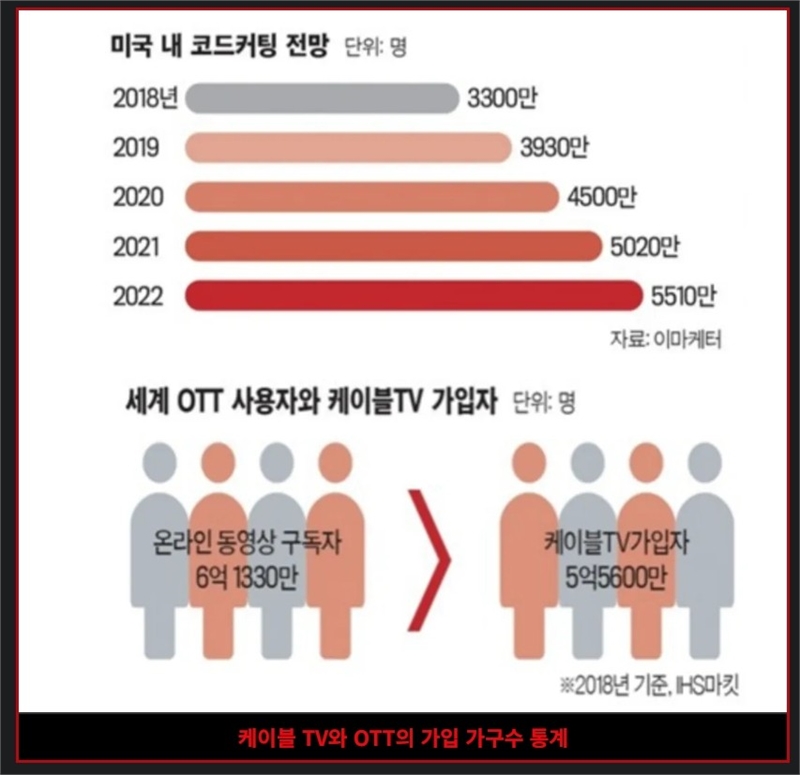 2018년 기준 OTT 가입 가구수는 케이블 TV 가입자 수를 훌쩍 넘어서고 있다.