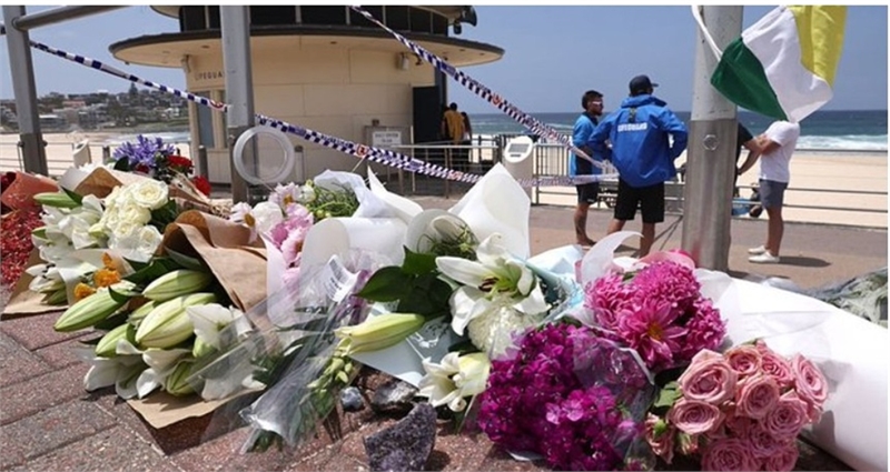 호주 시드니의 본다이 비치 해변에서 벌어진 총기 난사 사건의 희생자들을 애도하는 꽃다발들이 놓여 있다.
