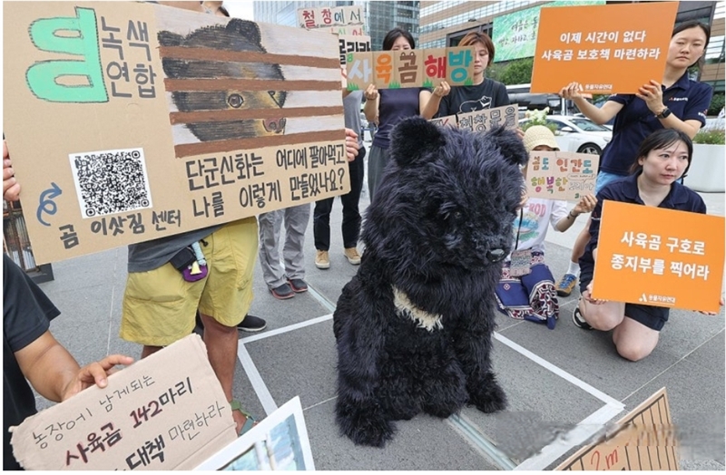 녹색연합 등 시민단체들은 지 7월22일 서울 광화문광장 이순신 동상 앞에서 열린 '곰 사육 산업 종식에 환경부의 책임있는 자세 촉구' 기자회견에서 퍼포먼스를 하고 있다. 농가의 곰 사육과 웅담 채취등 관련산업은 야생생물법 개정중 유예기간을 끝내고 2025년 12월 31일로 종식된다.