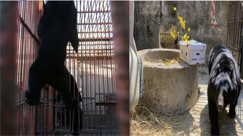 앞 서 곰 사육 사업장의 철창에 갇혀 있던 곰들 (좌측) 및 동물보호단체등이 운영하는 임시 보호시설로 옮겨진 구조된 곰의 모습.