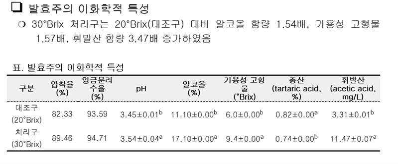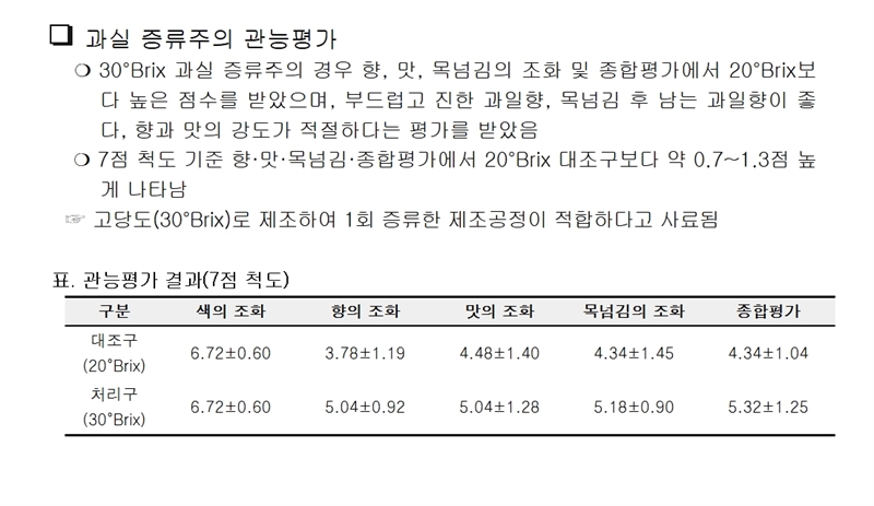 국립식량과학원 연구진은 포도 과즙 당도를 약 30브릭스(°Brix)까지 높이고, 이에 맞춘 발효 조건을 적용했다. 이렇게 발효 단계에서부터 고알코올 과실주를 확보한 뒤 단 한 번의 증류만으로 알코올 약 40% 내외의 포도 증류주를 제조하는 기술을 개발해 특허등록을 완료했다.