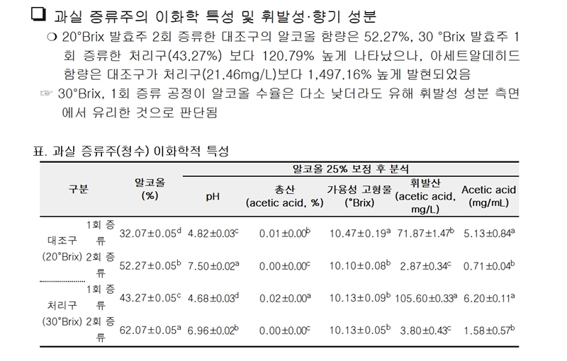 증류 전 과정에서 메탄올·아세트알데히드 함량은 모두 식품공전에서 정한 기준 이하로 검출돼 안전한 증류주 생산이 가능하다.