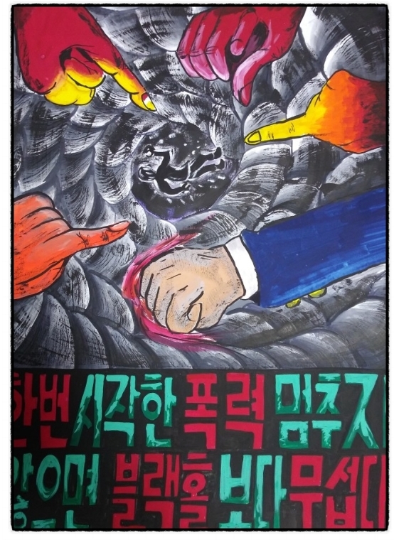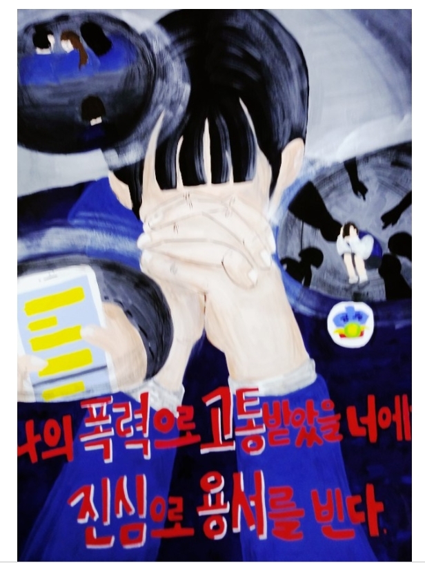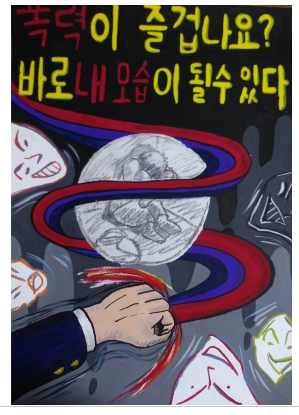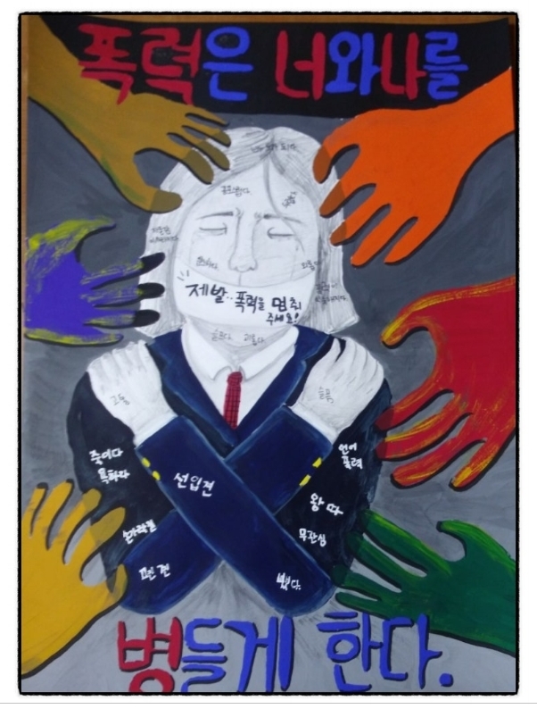 ▷ 아래는 모 중,고등학교 학폭 방지를 위한 포스터 그리기 대회에 출품 및 수상한 그림들이다. ; 그린 학생들의 이름 기재는 생략하였다.