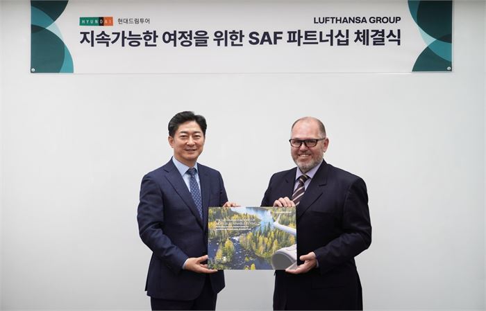 (서울=연합뉴스) 신선미 기자 = 현대드림투어는 루프트한자 그룹 항공사와 '지속가능 항공유(SAF·Sustainable Aviation Fuel) 구매 계약 파트너십'을 체결했다고 15일 밝혔다.