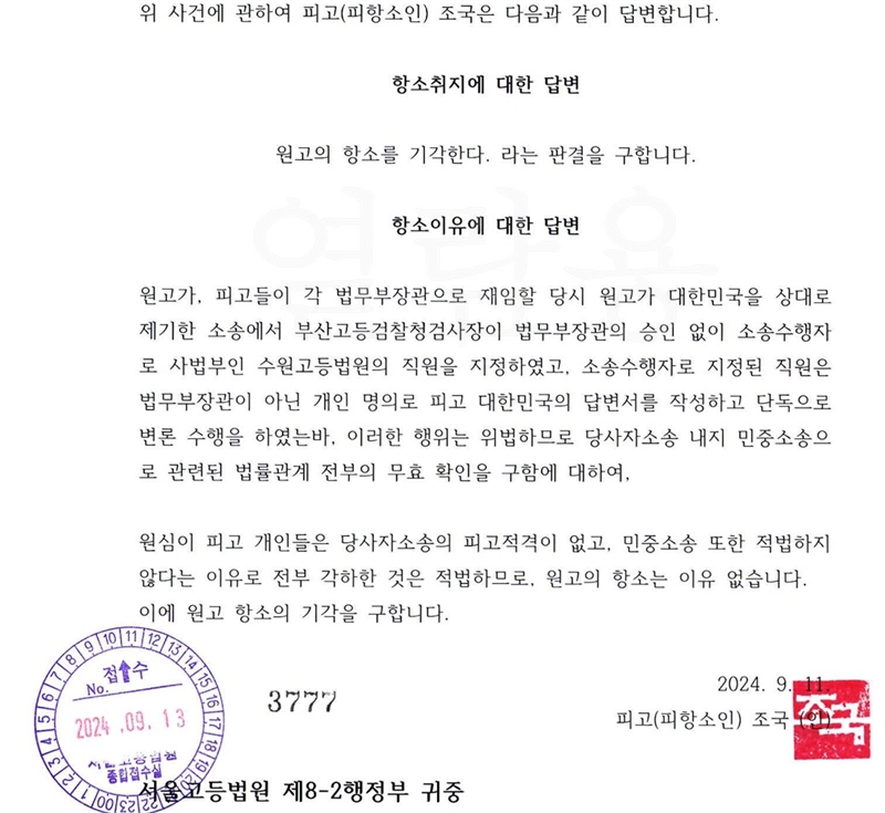 소갑 제9호증 "대한민국 소송수행자 정용석" 기재 대한민국 답변서 ; 법무부장관 인장 승인서등 없음.