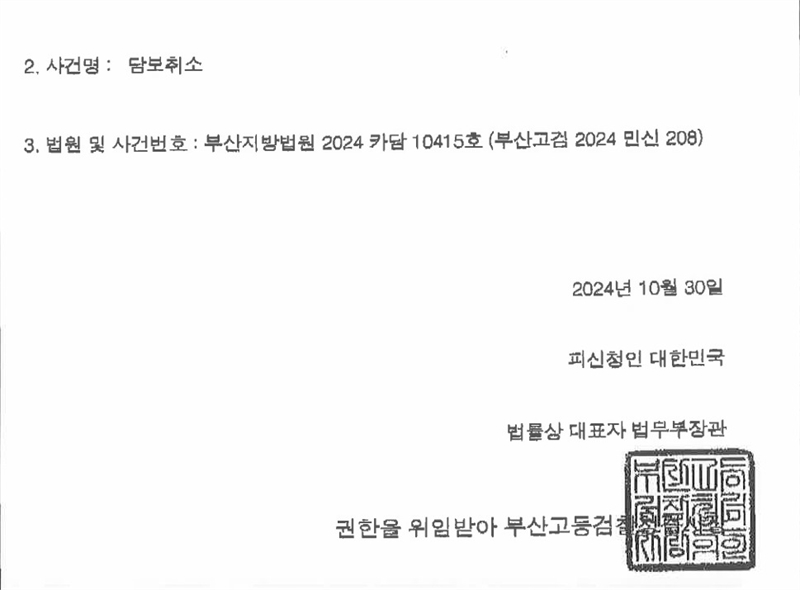 (2024카담10415 담보취소 신청에 대한) 부산고등검찰청검사장의 복대리인 (무관한) 사법부직원 소송수행자 지정서 ; 법무부장관 인장 승인서등 없음.