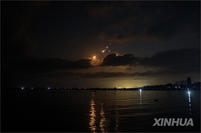 가자지구에서 바라본 이스라엘에 떨어지는 이란제 탄도미사일들 [신화 연합뉴스 자료사진. 재판매 및 DB 금지]