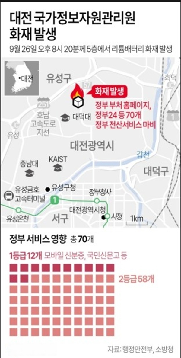 이 화재로 정부24, 모바일 신분증, 국민신문고 등 약 70개 정부 온라인 시스템이 중단되고 중앙 부처 홈페이지 접속마저 장애를 일으키며 대규모 마비사태가 발생했다.