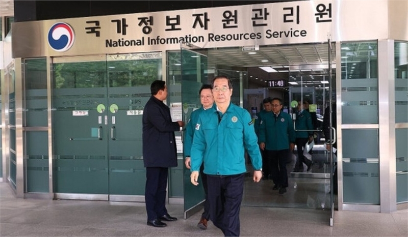 당시 한덕수 국무총리가 국가정보시스템 서비스 장애 발생 다음날인 18일 전산망 복구 작업이 진행되고 있던 대전 국가정보자원관리원을 방문해 현장 점검에 나섰다.