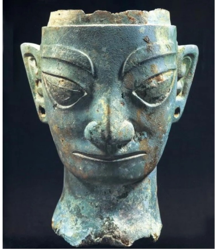 청동으로 된 사람머리상. 높이 29㎝ 폭 20.6㎝ 무게 4.483㎏이다. 처음 삼성퇴 유적에서 이런 청동머리상이 확인되자 발굴단원들이 부들부들 떨었다고 한다. (사진 : 샨싱두이 박물관)