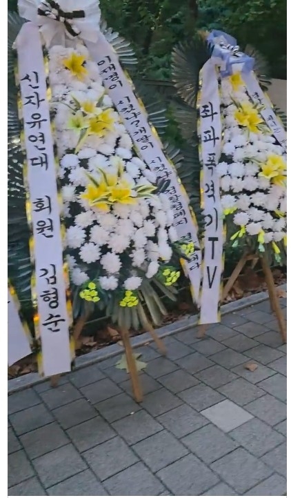 야당 국민의힘을 포함 신자유연대 등 단체들이 대법원 앞에 가져다 세워놓은 화환들.
