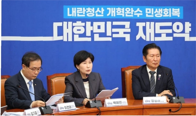 (사진의 오른쪽부터 여당 정청래 당대표, 박혜련 사개특위 위원장, 및 재판소원을 발의하게 될 김기표 의원)
