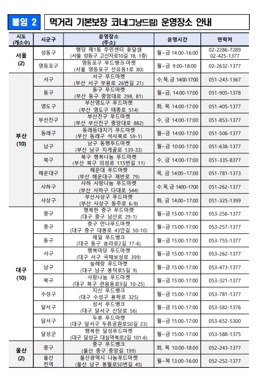 ; 먹거리 기본보장 코너(그냥드림) 운영장소 안내표 첨부.