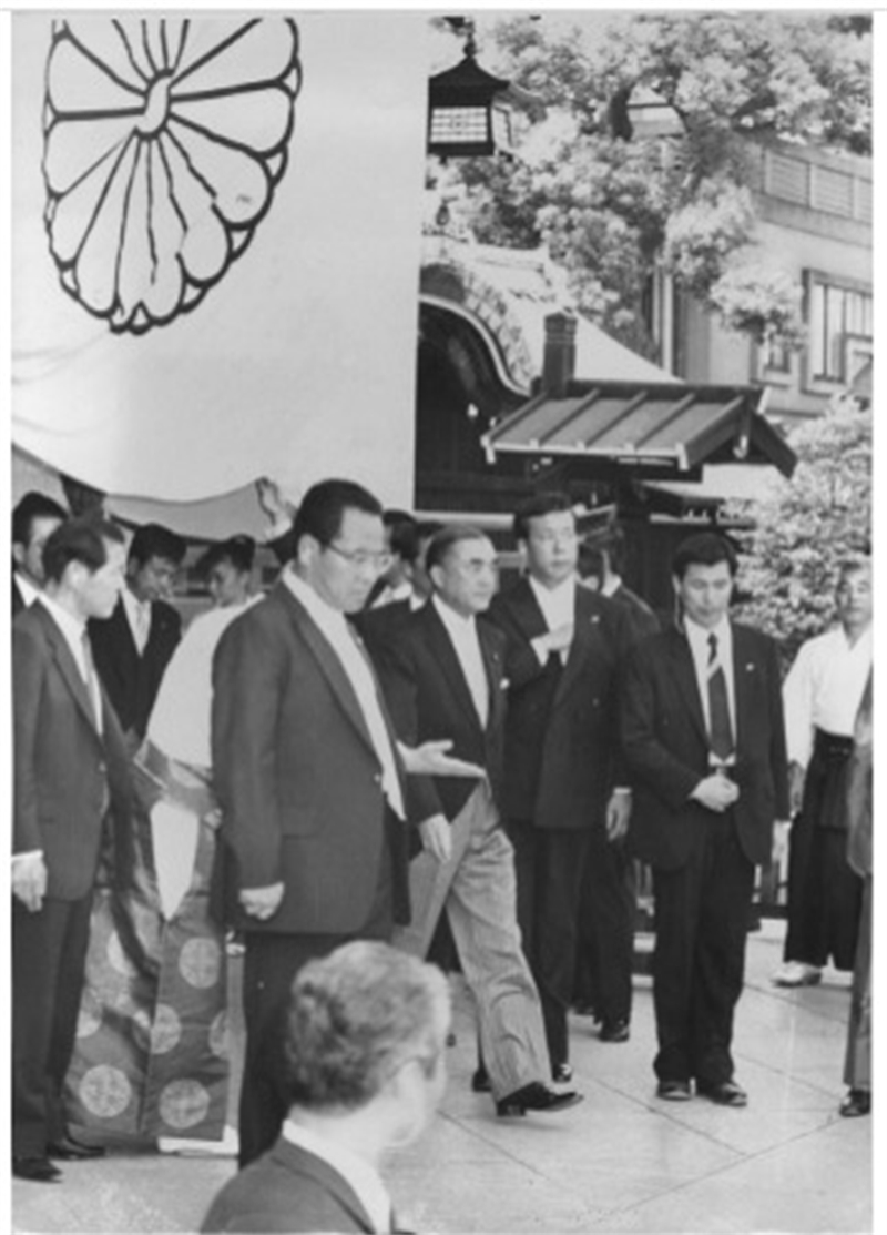 1985년 8월 나카소네 야스히로 총리는 엄격한 경호 혹은 호위를 받으며 야스쿠니 신사를 첫 공식 방문했다.