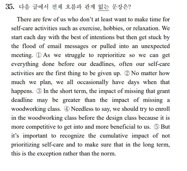 35번. (출제자님들,) the woodworking class는 the design class 만큼 뜬금(?) 없습니다. 연방의 보조금, 연금 따위를 grant로 지칭한다는 사실을 알아야 하는 것으로 보든 않든, 문맥 상 데드라인의 임팩트가 더 중요하다는 흐름은 가능하다고 봅니다.